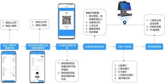 訪客系統(tǒng)也支持邀約訪客來(lái)訪,無(wú)需訪客填寫(xiě)信息,由邀約人填寫(xiě)訪客信息并通過(guò)微信或短信通知訪客,同時(shí)生成通行二維碼,訪客到訪可刷臉或刷二維碼通行。