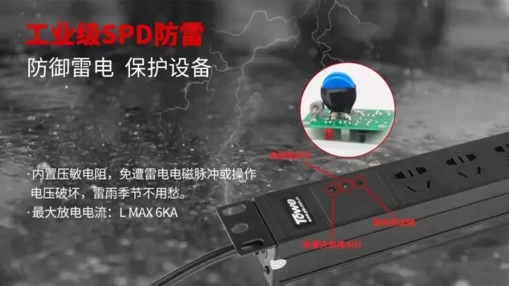 同為PDU依據IEC標準設計,內置自主研發的高性能防雷元器件,專為機房內通信、電子設備在操作過電壓和雷電感應頻繁的場合而設計,讓設備在極端下免受雷電電磁脈沖和浪涌侵襲破壞。在PDU電源頂端,附帶有防雷失效指示燈、電源指示燈和一個接地測試鍵,方便機房管理人員對PDU的工作狀態和功能狀態進行檢測,其標識含義分別為:(1)電源指示燈:電源接通后,電源指示燈顯示為綠色;(2)防雷失效指示燈:紅燈亮起,表示防雷功能失效,方便用戶及時更換維修。(3)接地測試鍵:電源接通后,按下接地測試按鈕,電源指示紅燈亮起則表示接地正常。