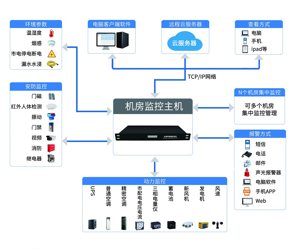 隨著信息網絡技術的不斷發展,各類規模大小不等,設備種類、數量不同的網絡設備機房廣泛分布于用戶各分支機構所在地域,由于欠缺與運行網絡的規模體系相對稱的運維系統,數量眾多的無人值守機房的物理運行環境狀況、動力配電狀況、設備運行狀況、人員活動狀況以及消防狀況的變化包括可能出現的危急狀況,均無法得到及時的發現和處理,也就很難被有效預見、防范和避免。因此,一套完善的機房環境監控系統對于機房、IDC等場所非常重要。