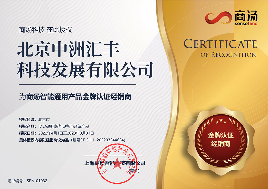 商湯智能通用產品金牌認證經銷商稱號不僅是對中洲匯豐的肯定,更是對我們的激勵!