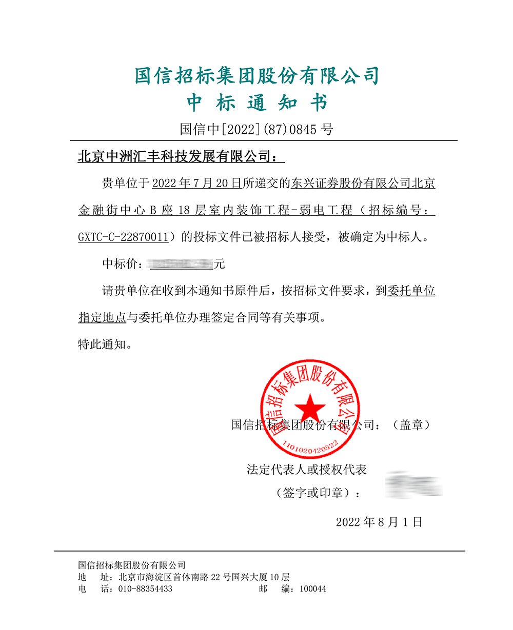中標東興證券股份北京金融街中心北樓B座18層室內裝飾工程
