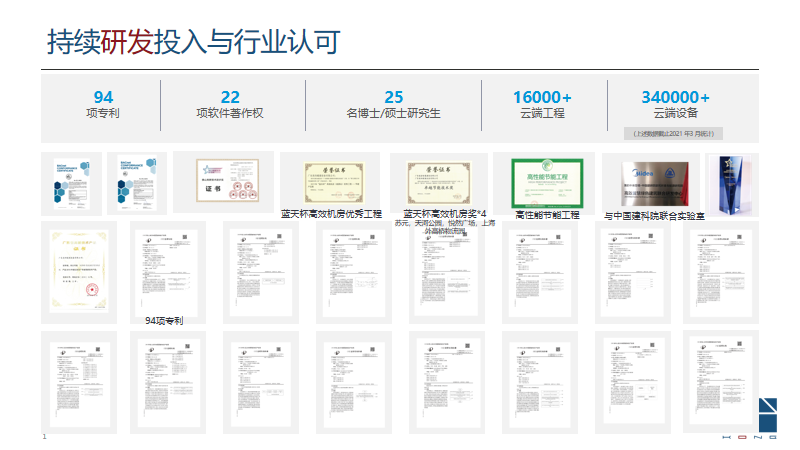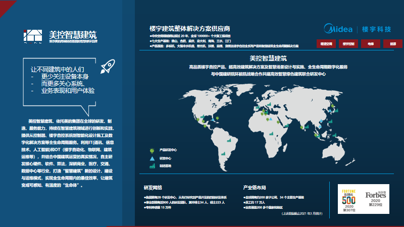 目前我們擁有5大制造基地,分別在廣東順德,佛山,重慶,以及意大利,2大全品類的全球研發中心,分別位于順德及上海。上海將作為美的全球第二研發中心,我們的樓宇科技研究院及美控智慧建筑也扎根在上海。另外還有N個產品研發中心,聚焦創新產品的開發。2020年在研發的投入超過10億元,研發人員占比大于10%,專利授權數量4600多項。
